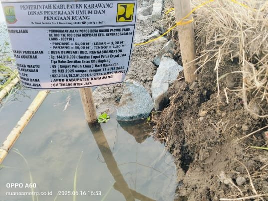 Hal ini terjadi diwilayah Desa Dewisari Kecamatan Rengasdengklok, Kabupaten Karawang, sebagian proyek Turap yang berasal dari Dinas PUPR Kabupaten Karawang, ketika wartawan media ini mendatangi lokasi, pekerja proyek malah mengatakan untuk media sudah dikondisikan silahkan hubungi Bapak anu (Wartawan.red) , bahkan sebagian wartawan yang biasa nguriling di Desa dewisari Kecamatan Rengasdengklok mengatakan hal yang sama ,” Untuk proyek turap itu Dakornya di Si Anu… Tinggal minta aja,” ujar nya.