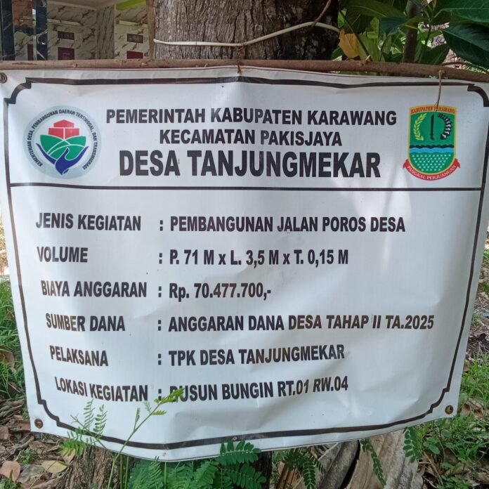 Karawang–Tinta Merah Net-Pembangunan jalan poros desa di Dusun Bungin RT 01/04, Desa Tanjungmekar, Kecamatan Pakisjaya, Kabupaten Karawang, yang dibiayai melalui dana desa tahap II tahun anggaran 2025, menuai sorotan warga. Pasalnya, kondisi jalan yang baru saja selesai dikerjakan itu sudah tampak retak-retak di sejumlah titik.