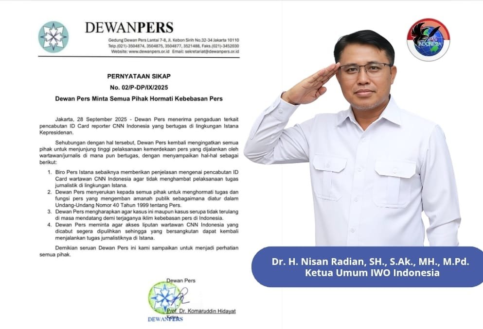 Menurut Nisan Radian, langkah Dewan Pers sudah tepat dan harus menjadi perhatian serius semua pihak. “Pers bekerja menjalankan fungsi kontrol sosial sekaligus mengemban amanah publik. Maka, setiap tindakan yang berpotensi menghambat kerja wartawan harus diluruskan. IWOI berdiri bersama Dewan Pers untuk menjaga marwah kebebasan pers,” tegasnya.