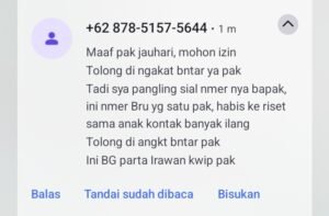 “setelah kirim pesan singkat WhatsApp kemudian orang tersebut menghubungi saya dengan panggilan Suara atau telepon namun karena gelagat nya kurang baik saya putus sambungan teleponnya,ungkap Jauhari