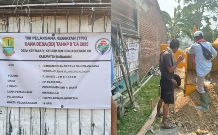 KarawangTinta Merah Net– Pemerintah Desa Kertasari, Kecamatan Rengasdengklok, Kabupaten Karawang, terus berkomitmen meningkatkan infrastruktur desa demi kenyamanan dan kesejahteraan masyarakat. Melalui Dana Desa (DD) Tahap II Tahun Anggaran 2025, Tim Pelaksana Kegiatan (TPK) telah merealisasikan kegiatan pembangunan sarana dan prasarana berupa pembangunan jalan lingkungan.