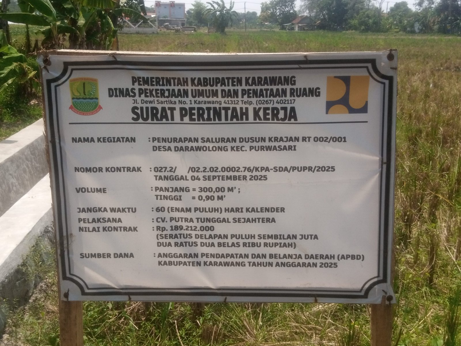Karawang –Tinta Merah Net– Pekerjaan proyek pembangunan turap saluran air di Dusun Krajan RT 002/001 Desa Darawolong Kecamatan Purwasari Kabupaten Karawang, diduga dibuat asal jadi.(11/10/25)